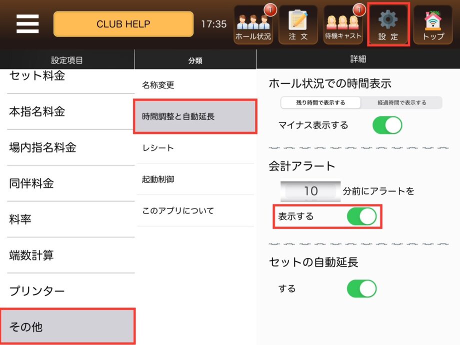 セットの終了時間前にアラートを表示する方法 カテゴリ ホール状況/ 入店〜退店/ 設定 セットの終了時間前に、ホール状況でアラートを表示する方法をご紹介いたします。 1. TRUSTアプリ画面右上の「設定」をタップします。 2. 設定項目「その他」→「時間調整と自動延長」をタップします。 3. 会計アラートの表示するを「ON」にします。 4. 何分前にアラートを表示するかは数字をスクロールすることへ変更することができます。 5.会計アラートは卓1のように「¥」マークが表示されます。