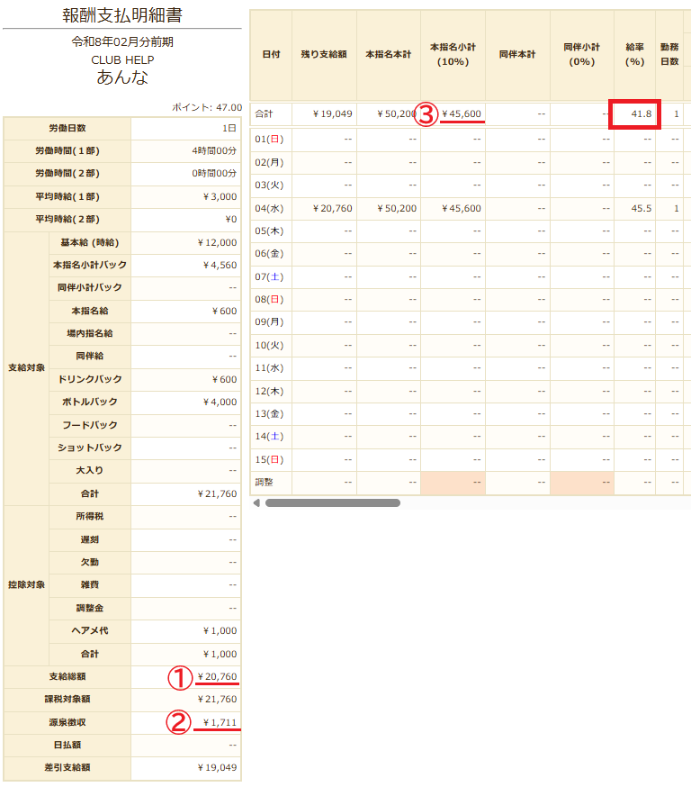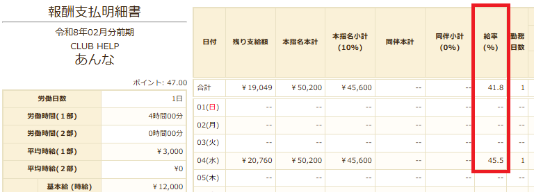 ※単日の給率にはホステス源泉徴収が計算に含まれていないため、出勤日数が1日の場合でも数値が異なる場合があります。