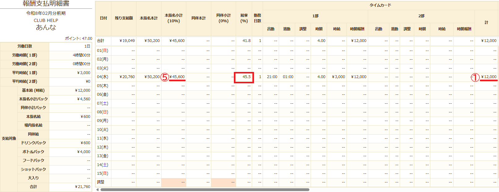 ② キャスト個人名を選択すると、キャストごとに単日の給率も確認できます。