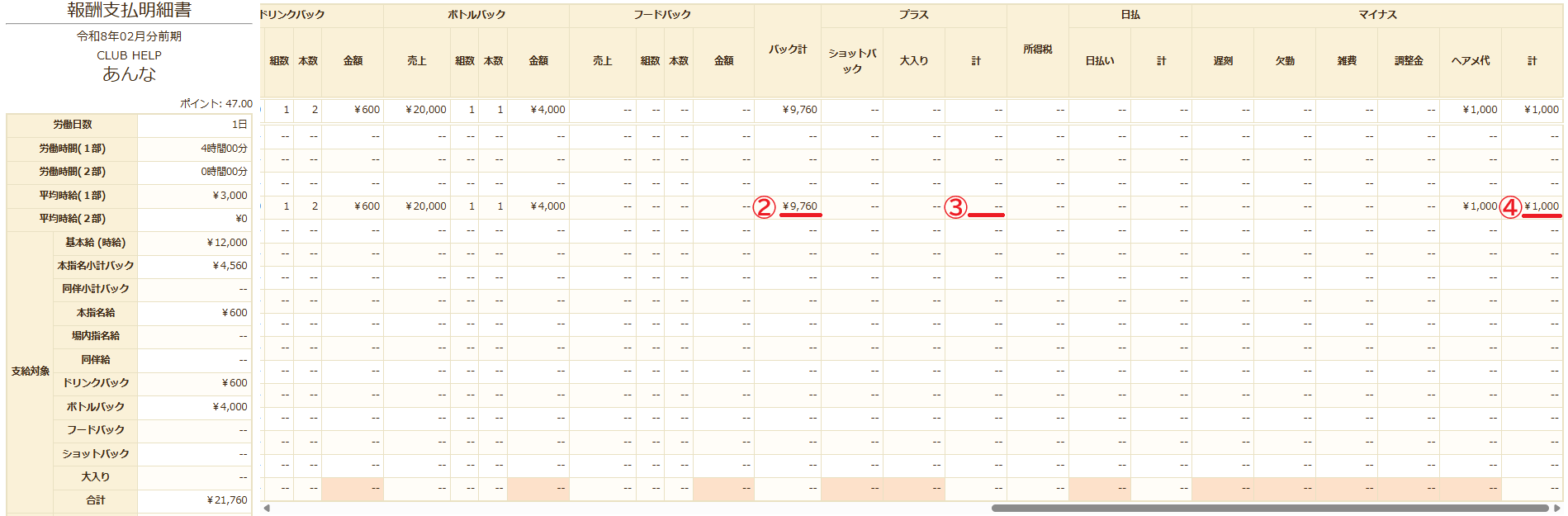 計算式【(①時間報酬 + ②バック計 + ③プラス計 – ④マイナス計)÷ ⑤本指名小計(単日)】