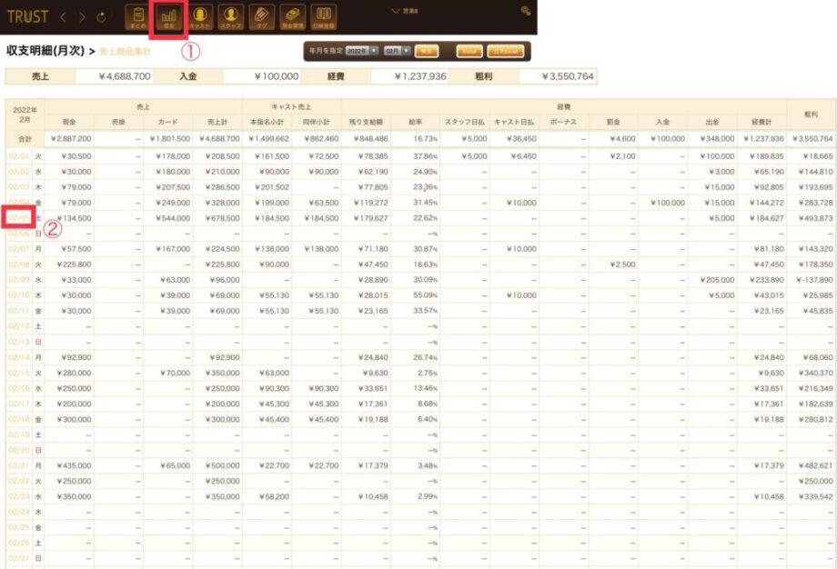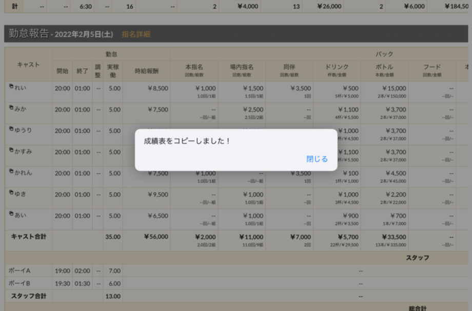 3. キャスト名の左上にある横のアイコンを押すと各キャストの成績給与をコピーができます。