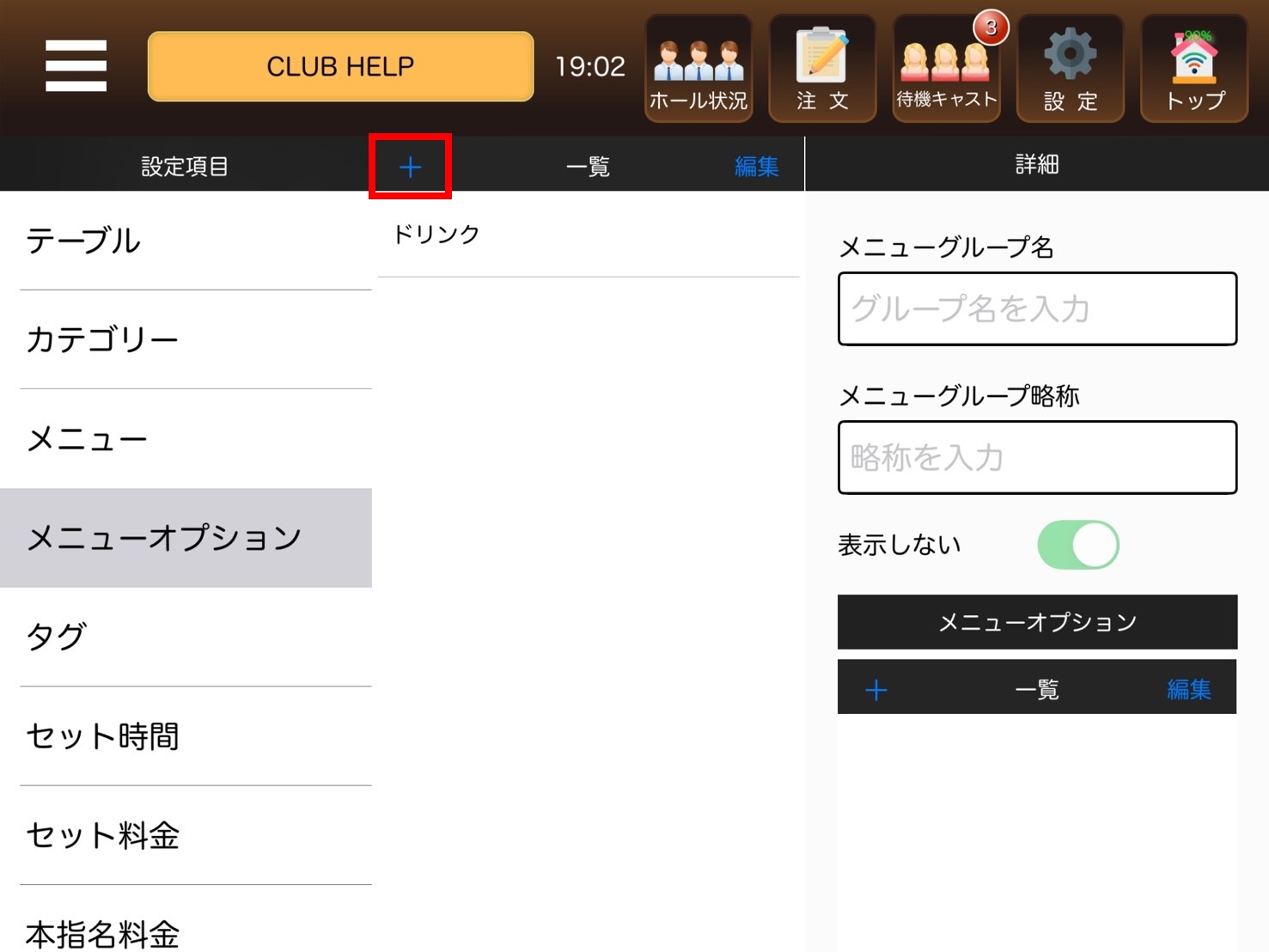 5.グループ名を変更したら、その下にあるメニューオプション一覧の「+」を選択します。