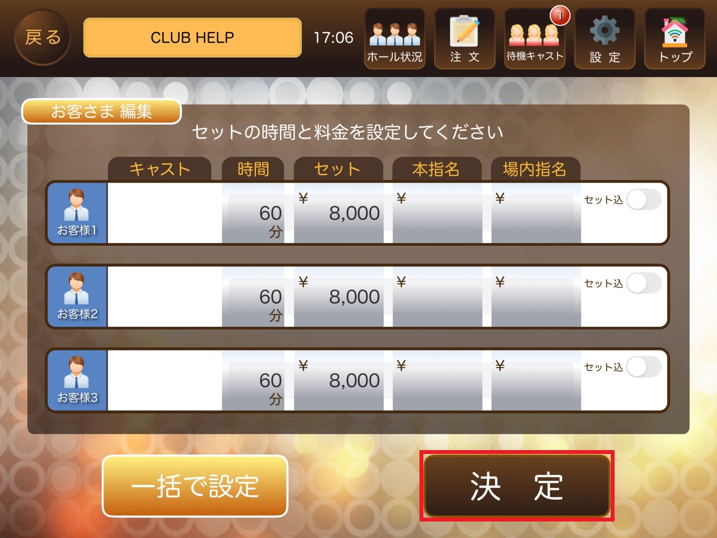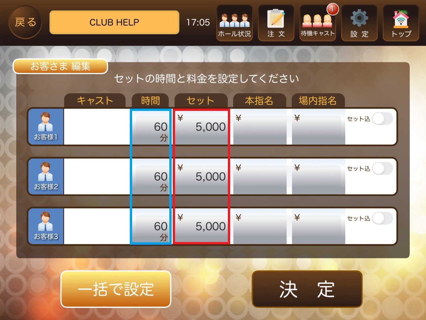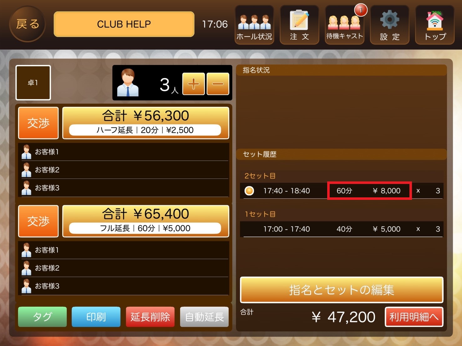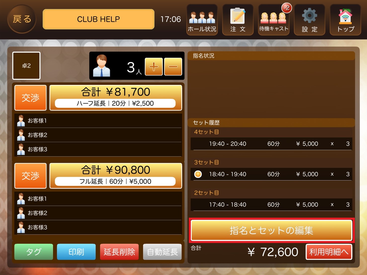 4. 画面右下「指名とセットの編集」をタップし3セット目の料金・時間を変更します。