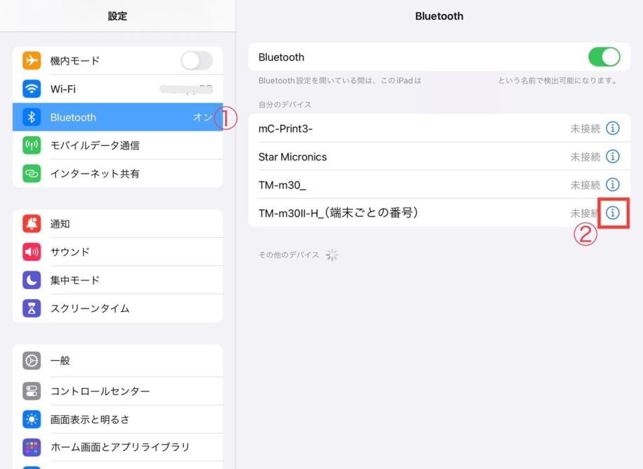 1.iPadの設定からBluetoothを選択(①)、デバイス欄に「TM-m30Ⅱ(-H) _”端末ごとの番号”」が表示されますので右隣りの「i」アイコン(②)を選択します。