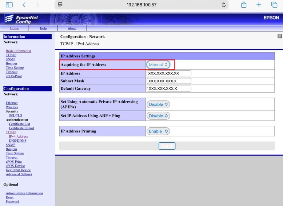6. Acquiring the IP Addressを「Manual(手動)」に変更します。